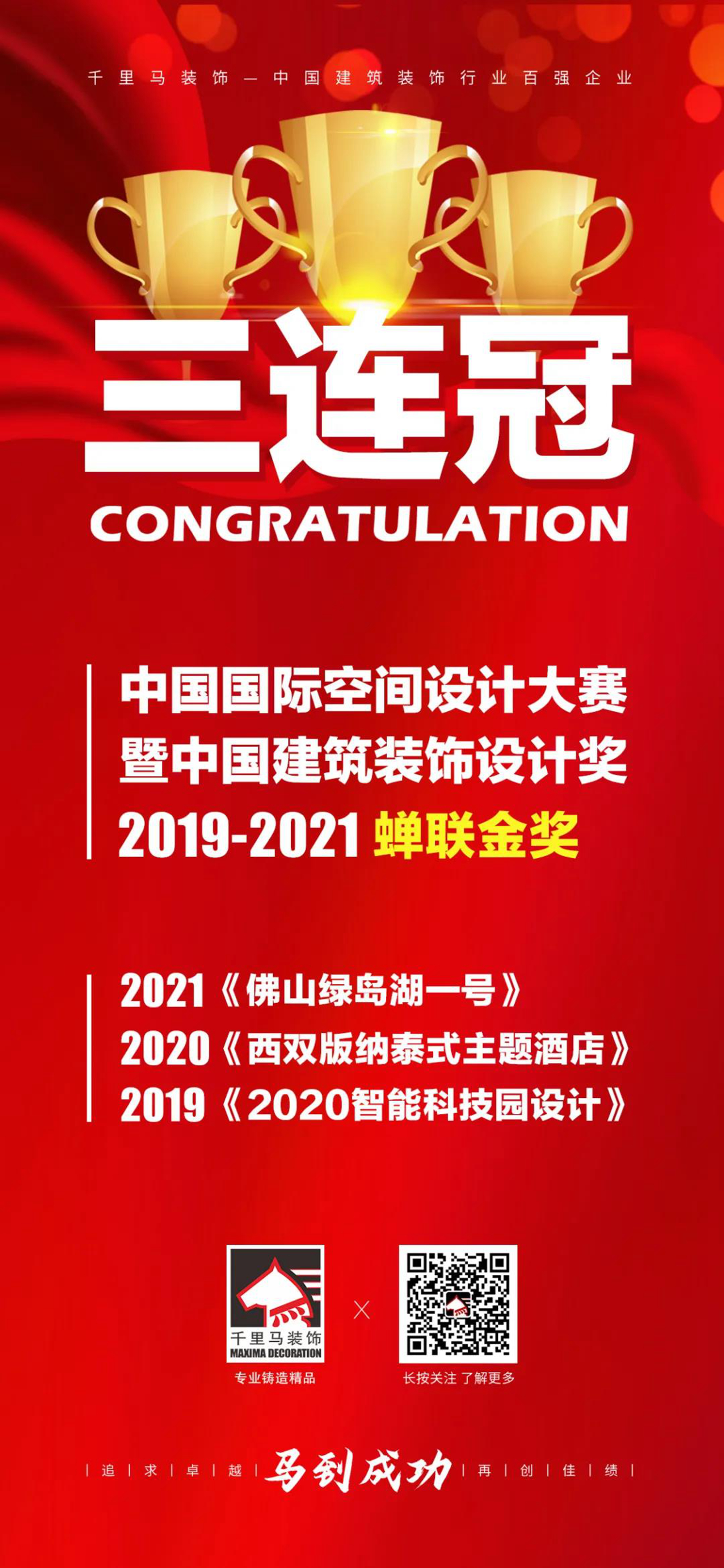 至此,千里馬裝飾集團已連續三年斬獲該大賽的最高榮譽“金獎”,這是對千里馬裝飾集團實力的最好詮釋。多年來,千里馬裝飾集團不斷加強人才隊伍建設,不斷深化裝飾設計水平。未來,千里馬裝飾集團將繼續秉承“致力于改善人類工作、生活環境”的使命,不斷加大技術研發和人才平臺建設的力度,爭取更大貢獻與榮譽。