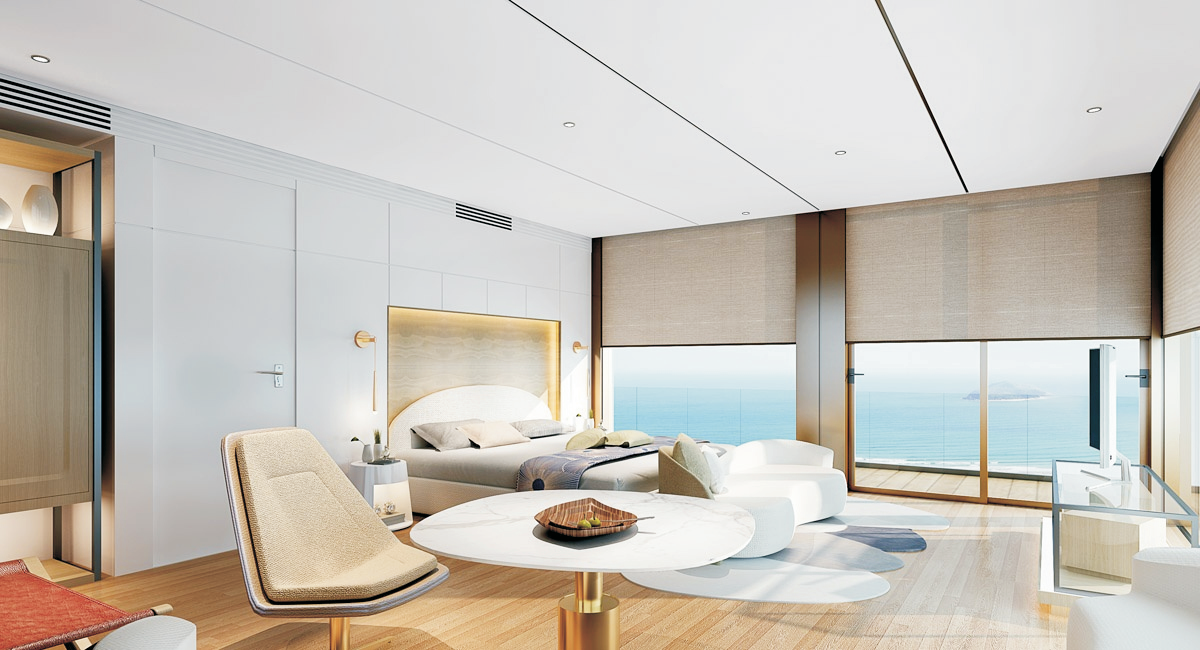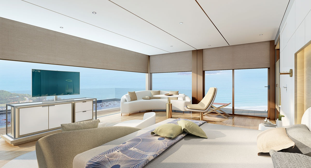 岶勞中集海上酒店項目為集裝箱式獨立建筑,漂浮在海面上,客房散落在海洋上眾多又美麗,可組合成不同的形狀,美得純粹而原生態,宅在房間里就能欣賞到360一線海景,獨一無二的眾多海底奇觀。在空間中形態中,“線”與“形”的元素貫穿場域,流線型幾何塊面的組合貫穿于整個酒店的設計之中,讓酒店像金石一樣歷久彌新,亦象征這酒店百舸爭流、乘風破浪、永攀新高的美好寓意。